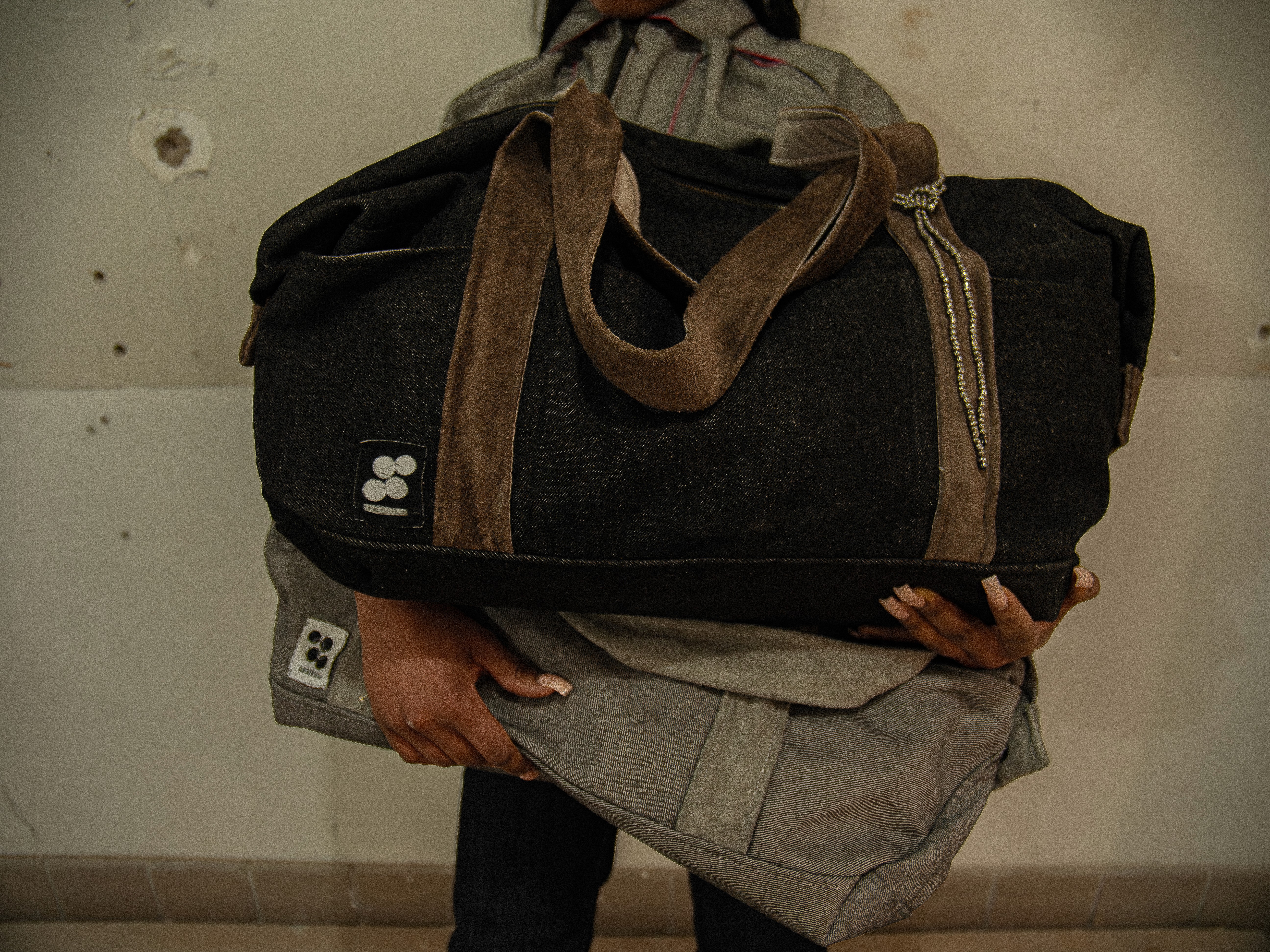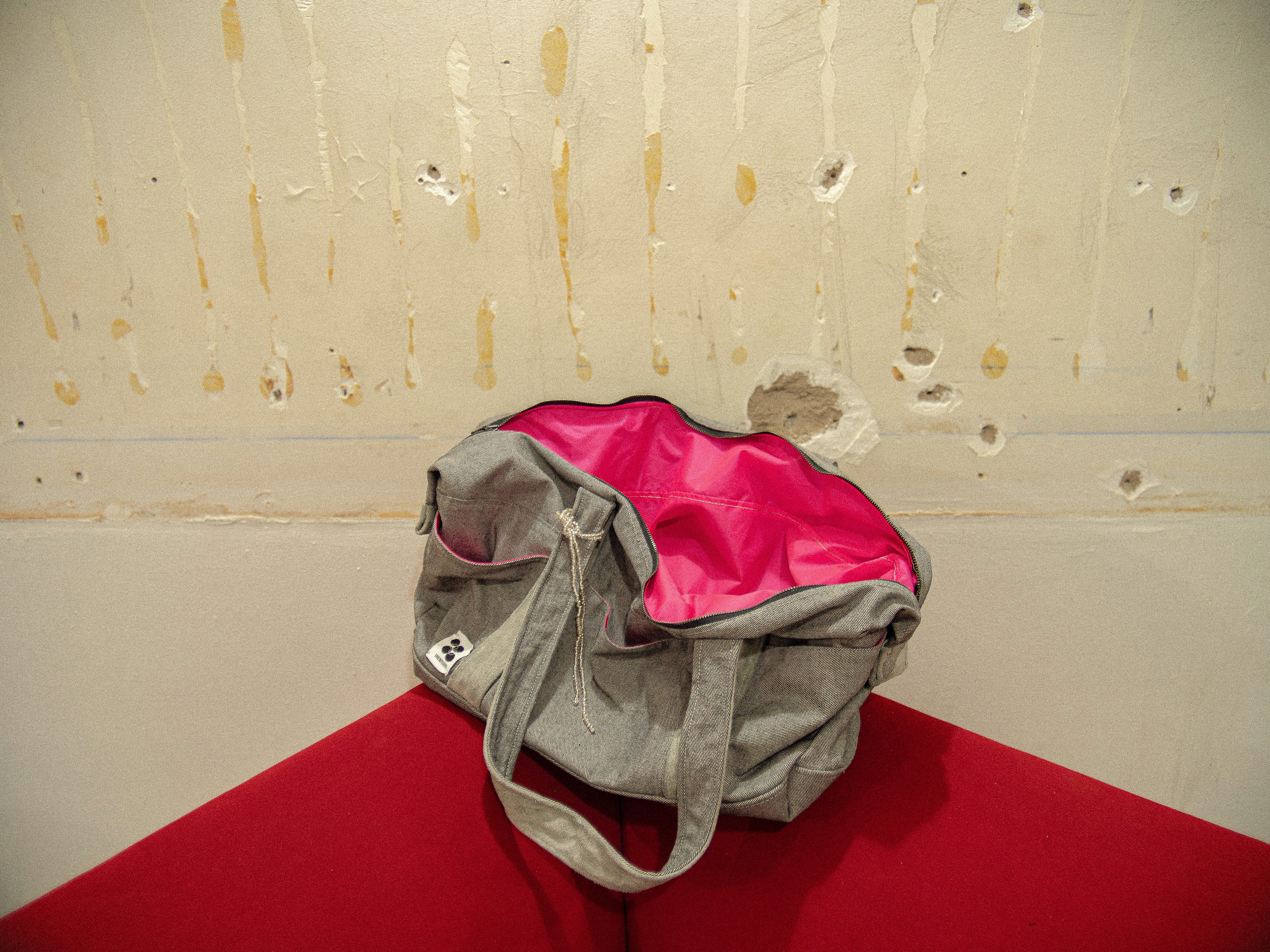 Materials for Grey & Pink____Grey denim, gray suede leather, and pink nylon, finished with a bead chain detail.
