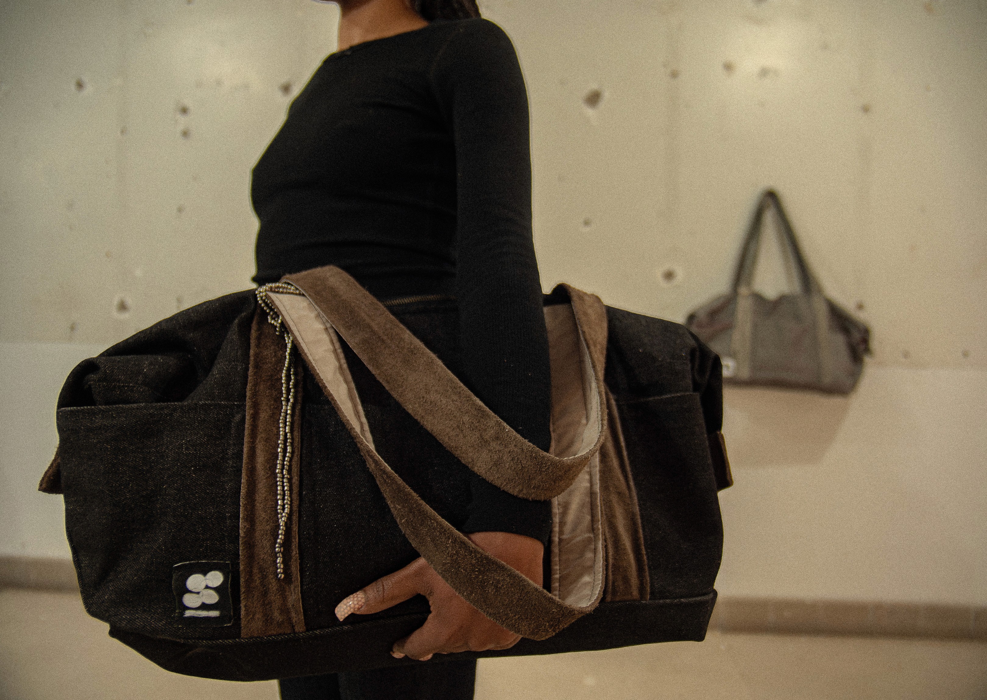 Materials for Black & Brown____Black Denim, brown suede, brown taffeta, and black/brown silk. Finished with a bead chain detail.