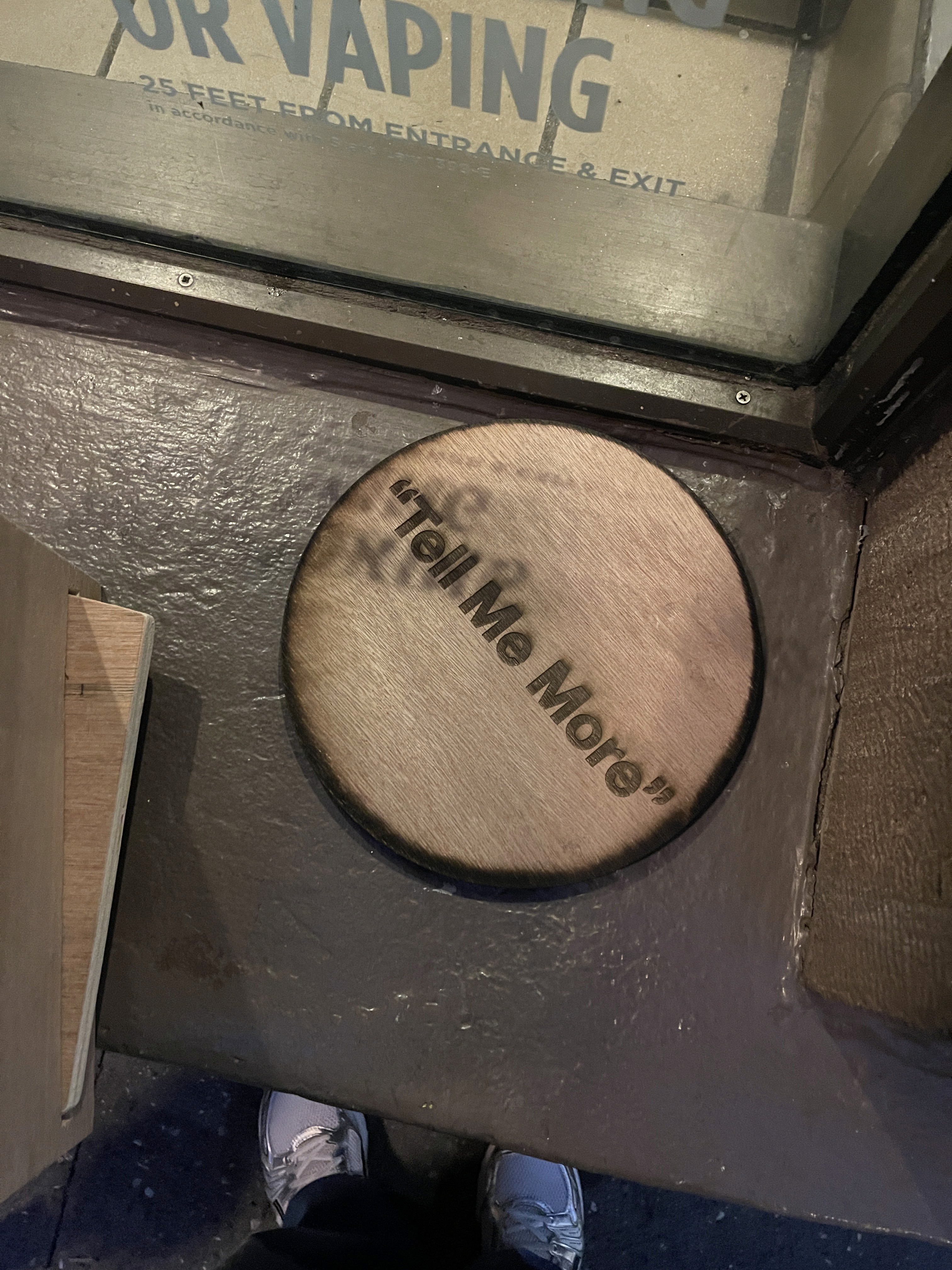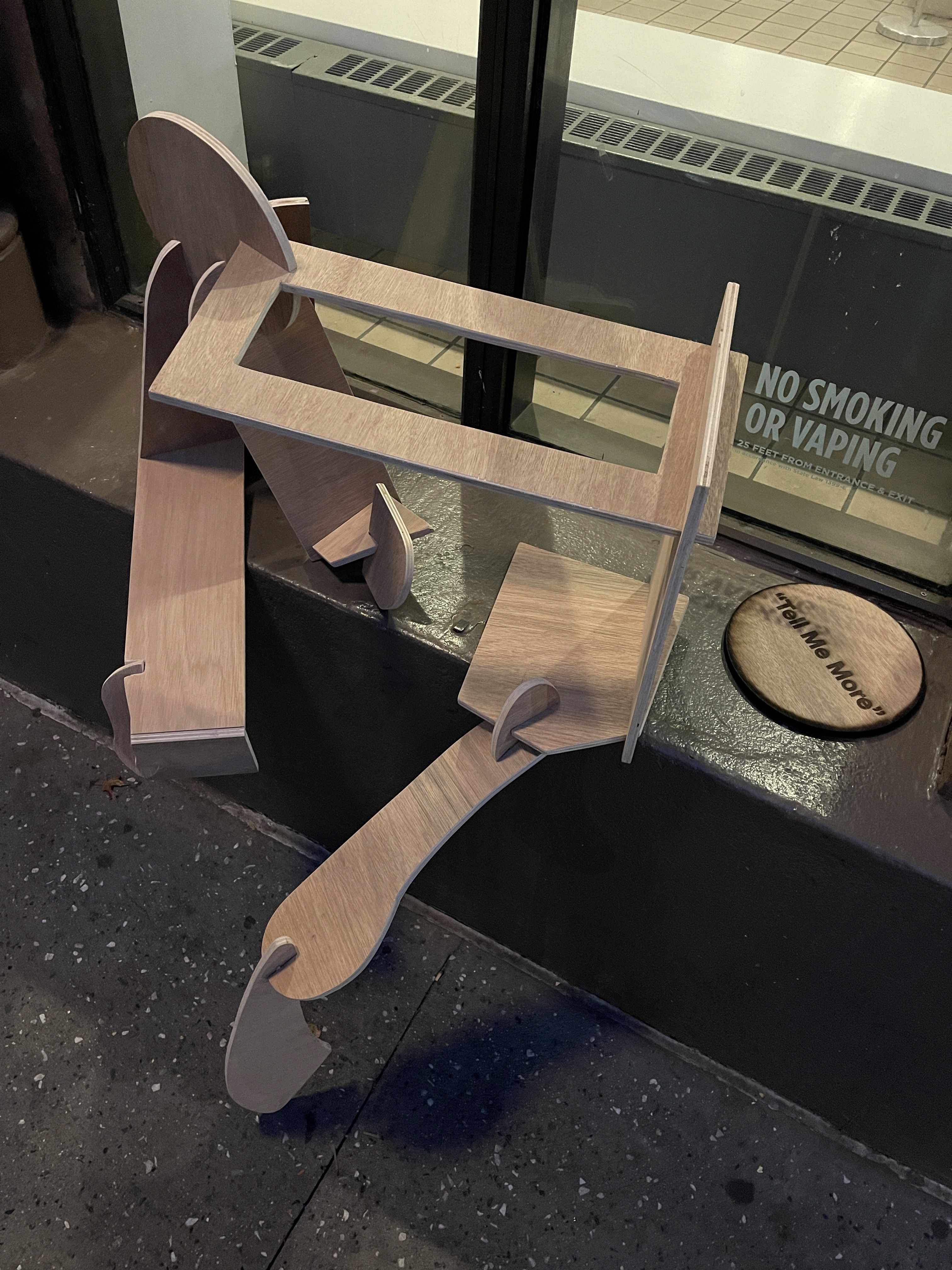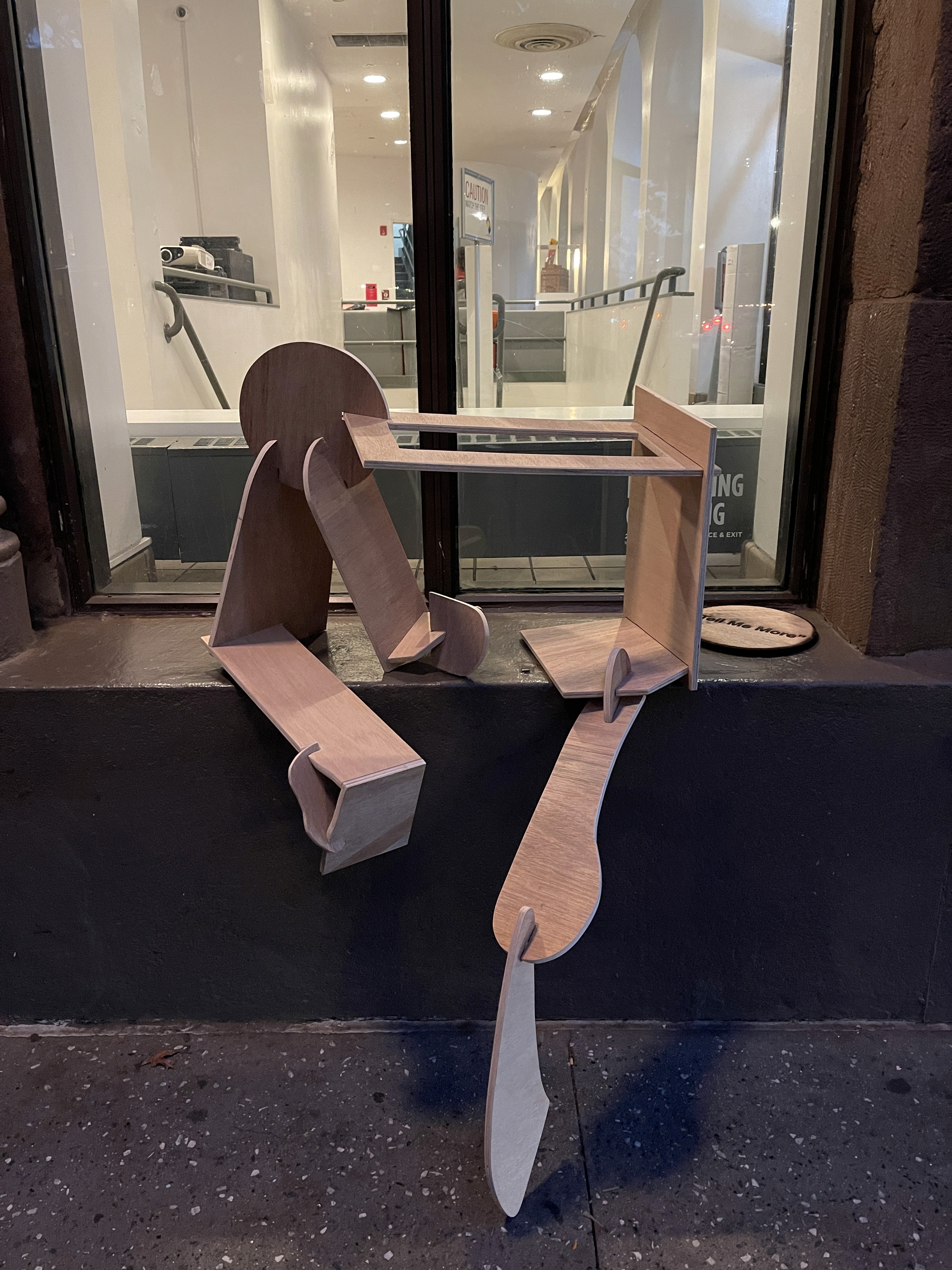 Tell Me More is a wooden sculpture sited on the seating platform in front of The Cooper Union’s Foundation Building. Responding to a historically significant yet constantly evolving space, the piece abstracts two human bodies seated in conversation. Constructed from wood, the sculpture reflects the durability and continuity of human presence shaped by daily interaction. The phrase “Tell Me More,” placed on a wooden circle behind the forms, functions as a threshold, inviting dialogue while emphasizing the platform as a space that remains both solid and continually reshaped by those who occupy it.